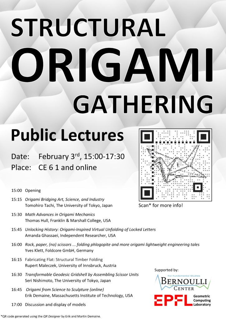 I am very happy to be allowed to give a short talk at the Structural Origami Gathering in Lausanne on February 3rd!