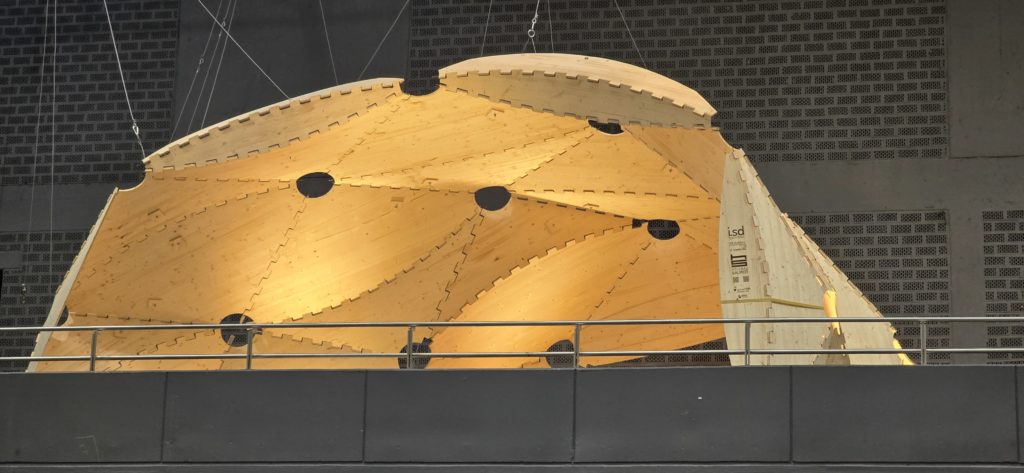 The sheet of material consists of 19 mm laminated timber plates, connected with special hinges that allow rotation along their edges. The idea for these hinges was originally developed during a research-driven course at the i.sd – University of Innsbruck together with a group of students. The initial idea and the design of the structure also originated during this course. As the complexity of the entire approach was very demanding, the project was further developed by the research team of the “Plates 2 Structures” project into this demonstrator.
