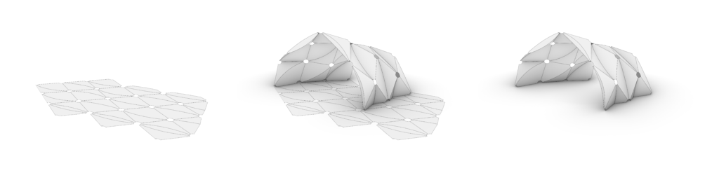 As a materialized manifestation of research-driven teaching, the QuadFold allows students to gain insight into state-of-the-art research and understand the relationships between material, fabrication and assembly of complex systems, by learning the limiting parameters of the material such as maximum bending radii or machining limits. The aim of the demonstrator is the exhibition of the significant potential of folded and bent structures from thin wooden plates to achieve structurally valid configurations. The flat assembly before actuating the structure on site reduces the transport volume, while maximizing the spatial possibilities. We want to thank the FFG for their outstanding support of the research and the industry partner Holzbau Saurer for the technical and scientific support as well as for their high fabrication capabilities. We also want to express our gratitude to the organizers of the IHF for the great opportunity to allow us and the students of the Faculty of Architecture to undertake such an experiment at this exceptional location.